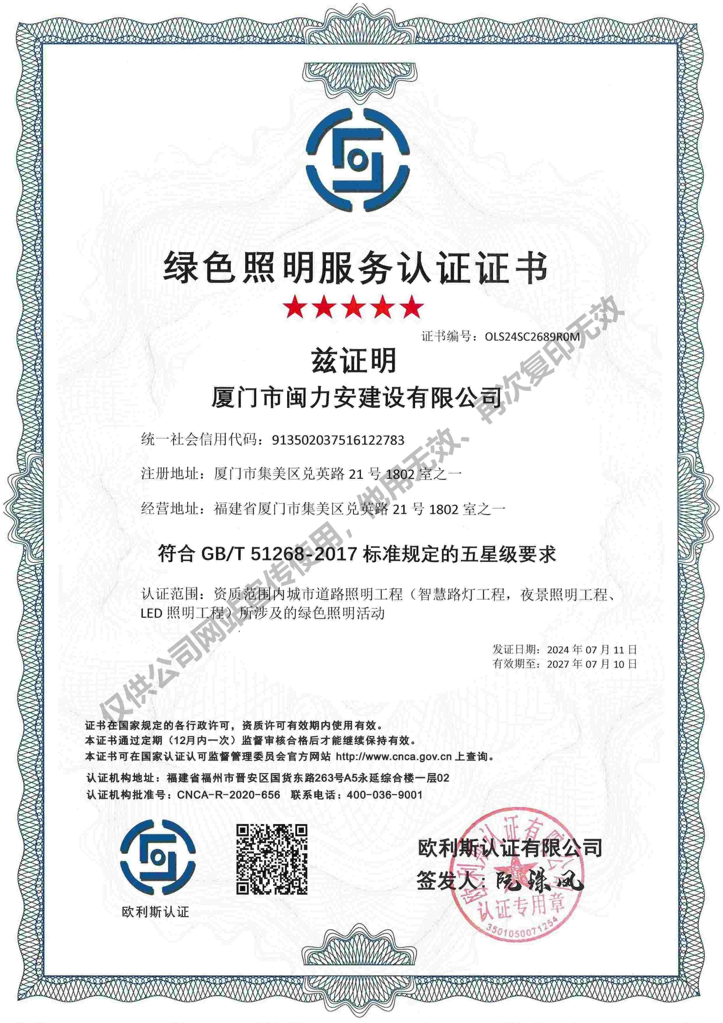廈門市閩力安建設(shè)有限公司成立于2003年,公司取得市政公用工程施工總承包貳級、建筑裝修裝飾工程專業(yè)承包壹級、城市及道路照明工程專業(yè)承包壹級、電子與智能化工程專業(yè)承包貳級、消防設(shè)施工程專業(yè)承包貳級、電力工程施工總承包叁級、建筑機電安裝工程專業(yè)承包叁級、輸變電工程專業(yè)承包叁級、環(huán)保工程專業(yè)承包叁級、照明工程設(shè)計專項甲級、建筑裝飾工程設(shè)計乙級、施工勞務(wù)等資質(zhì)的綜合型企業(yè),公司于2013年通過了ISO9001質(zhì)量體系認證,ISO14001環(huán)境管理體系認證,OHSAS18001職業(yè)健康安全管理體系認證。